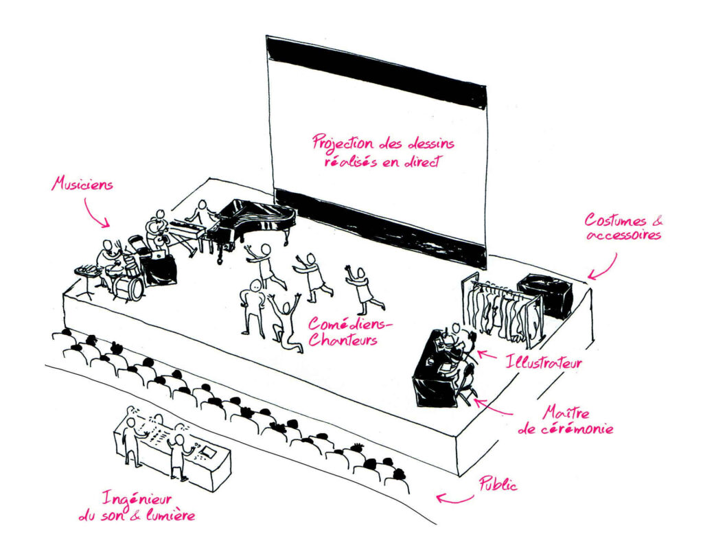 Sur scène, des comédiens chanteurs (4 ou 5), des musiciens (3 ou 4), un dessinateur et un maître de cérémonie improvisent intégralement une histoire d’1 h 20 à partir de suggestions du public.